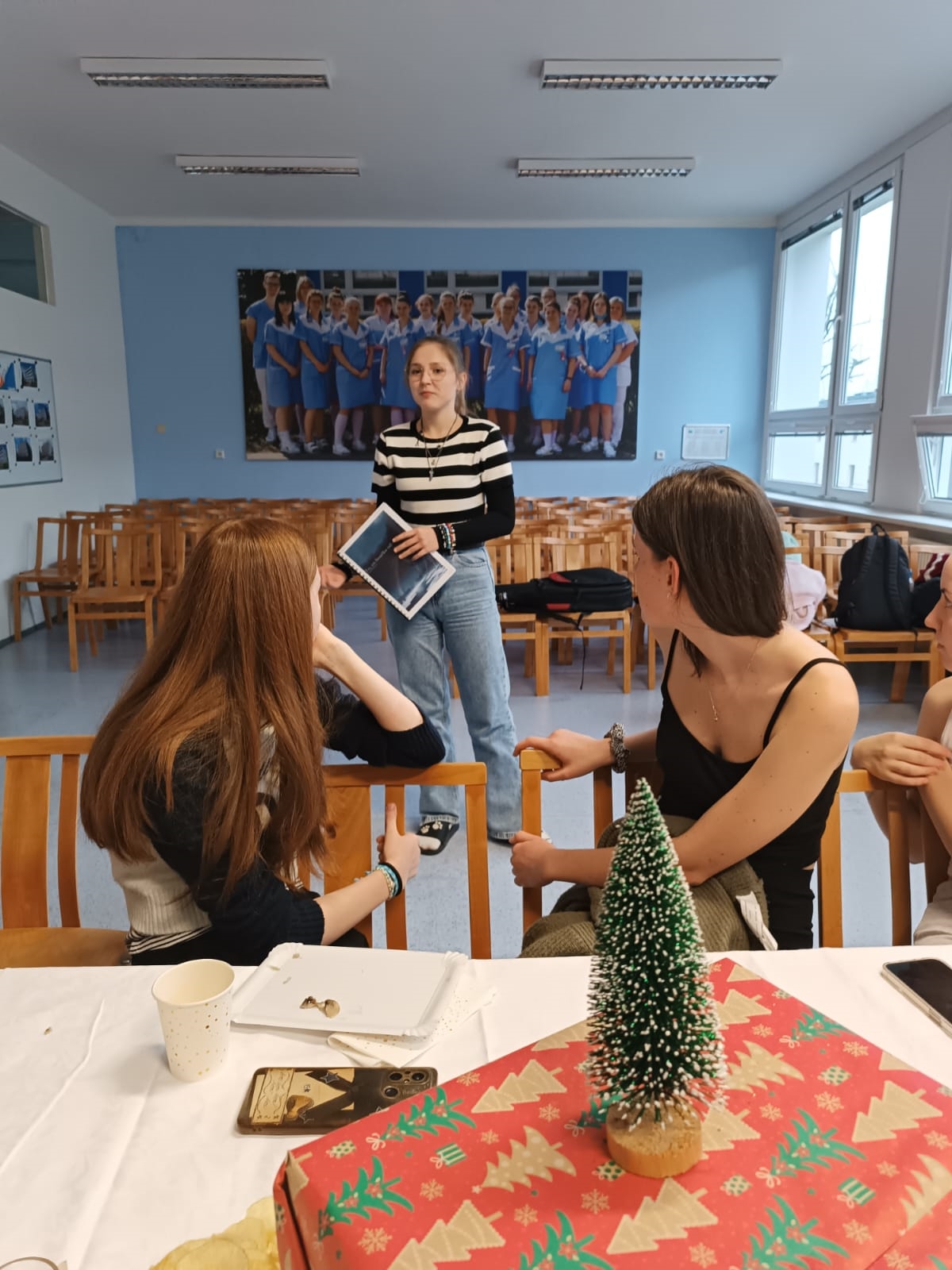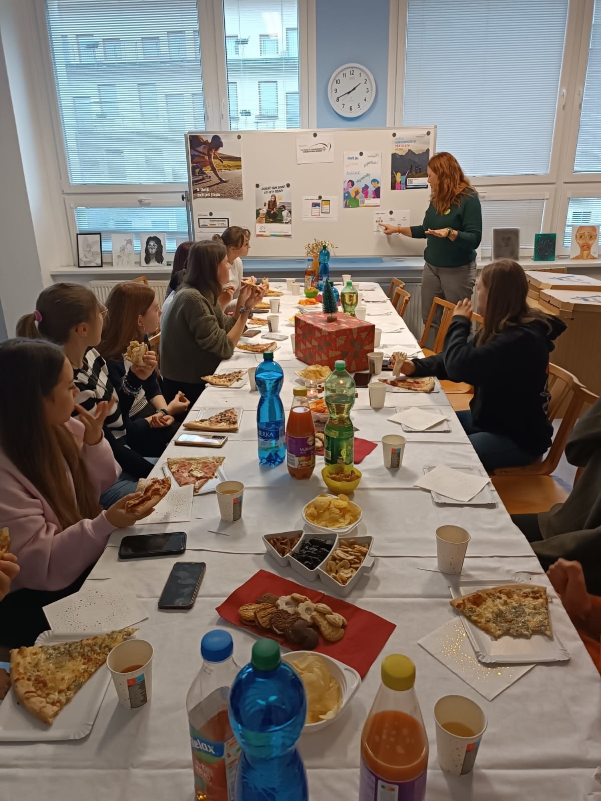 Ve středu 3. 12. 2025 v odpoledních hodinách se na naší škole konala velká „party akce“ všech dofáků a jejich vedoucích. Sešli jsme se spolu i s absolventy programu a užili si báječný kulturní program, o který se postarala Anička Hloušková svým kytarovým vystoupením, Mája Stránská autorským čtením své vlastní povídky To, co bouřka odnesla, Niki Svatá se s námi podělila o recepty ze své vlastní kuchařky, Anička Ferklová vlastnoručně vyrobenými náramky a Verča Haňáková nádhernými obrazy. To vše a mnoho jiného děvčata vytvořila během plnění svých aktivit DOFE a opravdu se mají čím pochlubit. Jako jejich vedoucí jsme na ně patřičně pyšné.