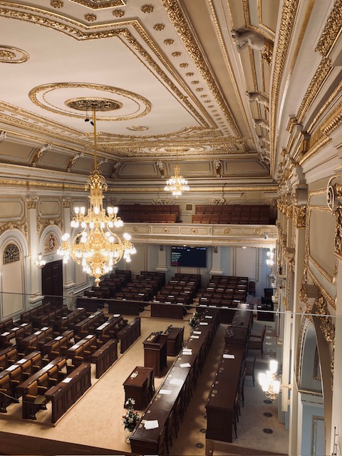 Poslaneckou sněmovnou nás provázel pan průvodce, který nám všechno poutavě vysvětloval. Viděli jsme jednací sál nejen z pohledu diváků, odkud může zasedání sledovat kdokoli, ale také jsme navštívili samotný sál. Tam jsme si mohli prohlédnout tlačítka, která se používají při hlasování, dozvěděli jsme se, kdo a kde sedí, a spoustu dalších zajímavostí.