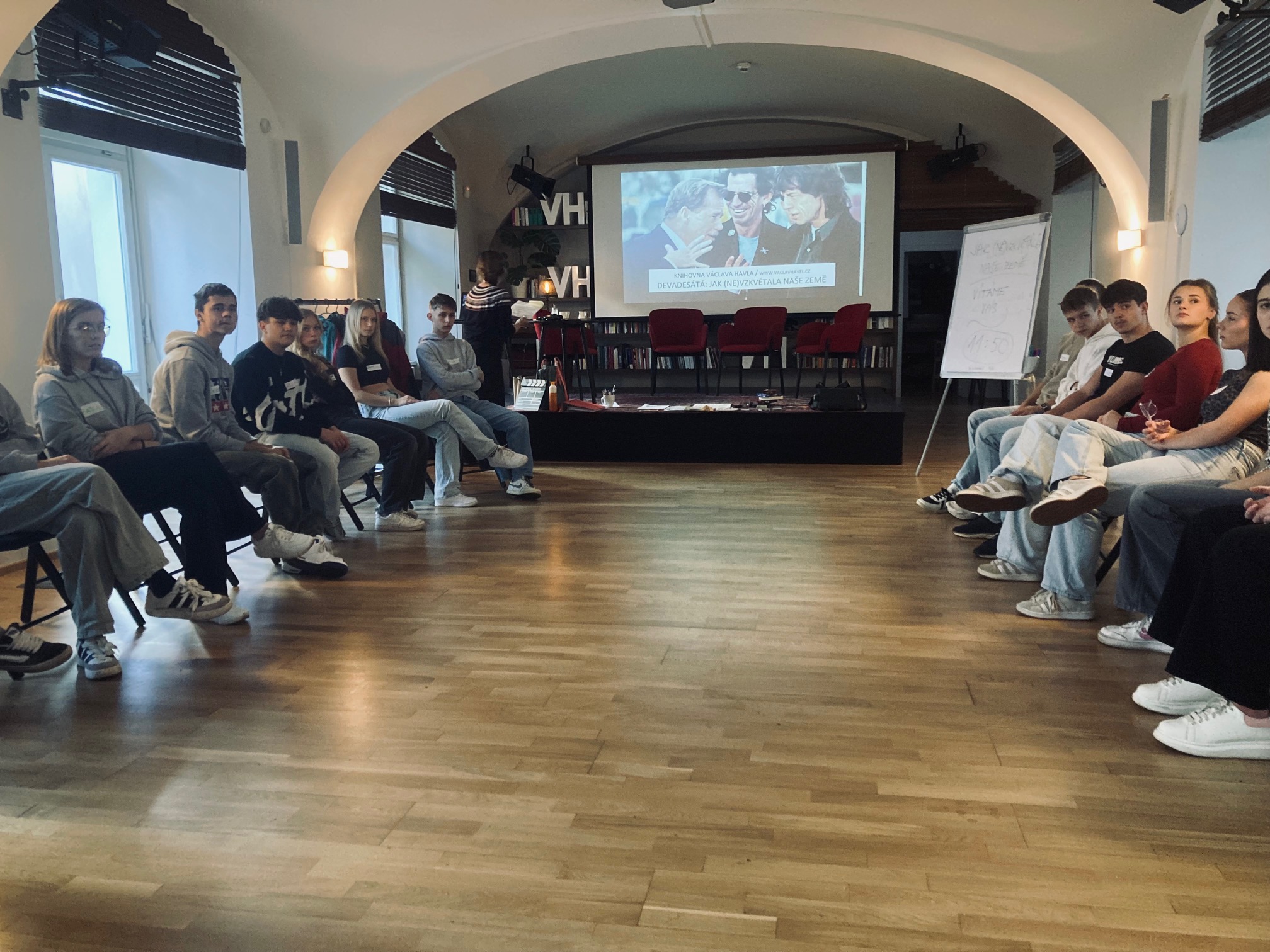 Odpoledne nás čekala návštěva Knihovny Václava Havla, kde jsme měli moc hezky připravený workshop Devadesátky. Nejen že jsme poznávali různé věci z této doby, jako například disketu, walkman, discman, mobilní telefon, gramofonovou desku, videokazetu nebo noviny, ale dozvěděli jsme se také, jak to tehdy fungovalo, co bylo jiné a co se dělo po vzniku demokratického Československa v roce 1989.