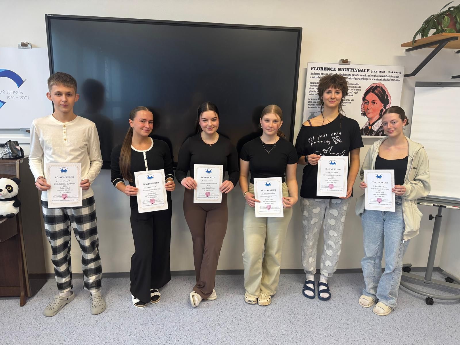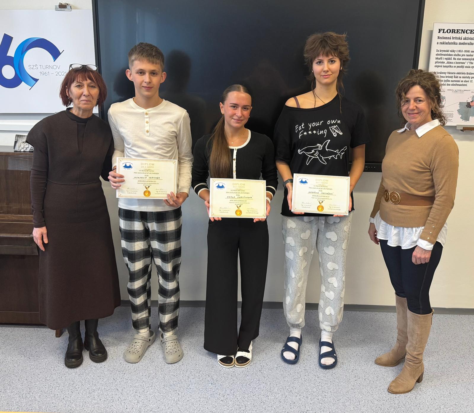 Vítězná umístění jsou následující: 3. místo Kateřina Matyášová 3. MA-SČ, 2. místo Mykhalio Vartsaba 2. MA-SČ a 1. místo Karla Martínková 3. MA-SČ. Velmi si vážíme účasti na psychologické olympiádě a děkujeme všem účastníkům za vynikající výkony.
