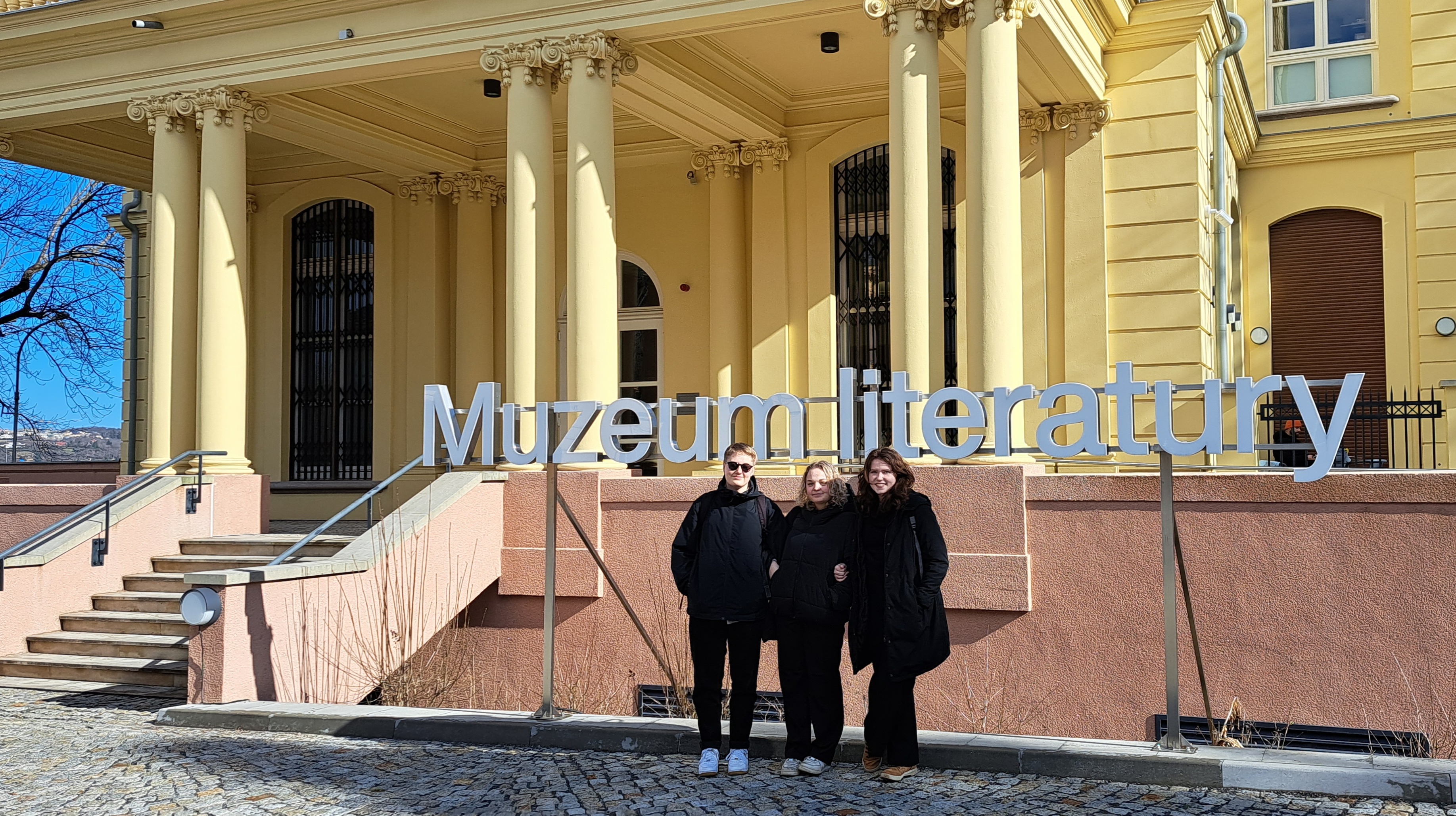Už po cestě metrem a tramvají se četbou informační brožurky připravujeme na naše první zastavení, kterým je Muzeum literatury. Naplněni očekáváním se dostáváme na Hradčanskou, pěšky to k muzeu není daleko a procházka mezi vznešenými domy je více než zajímavá. Muzeum literatury sídlí v bubenečské Petschkově vile teprve od loňského roku, což je na celém, nově zrekonstruovaném prostoru opravdu znát. Moderně pojatá expozice s mnohými interaktivními prvky a všudypřítomnými knihami nás opravdu oslovila. Proplétali jsme se mezi jednotlivými místnostmi, které vždy zachycují konkrétní období vývoje české literatury. Obdivovali jsme věci (např. žehličku z domácnosti Boženy Němcové, psací brk Josefa Dobrovského či krabičku s kadeří vlasů Karla Havlíčka Borovského), které patřily českým velikánům, kteří sice už nechodí mezi námi, ale jejich díla zdobí naše knihovny dodnes. Dokážete si představit, jak by se asi Mácha zapojil do naší doby? Jak by se oblékal? Jak by tvořil? S kým by se kamarádil? I takovou představu vám v muzeu pomohou vytvořit. Na konci čeká na návštěvníky hra s písmenky na magnetické tabuli. I my zde zanecháváme vzkazy stejně jako ti před námi. Expozice představí návštěvníkovi dějiny české literatury od dob národního obrození až po 20. století.