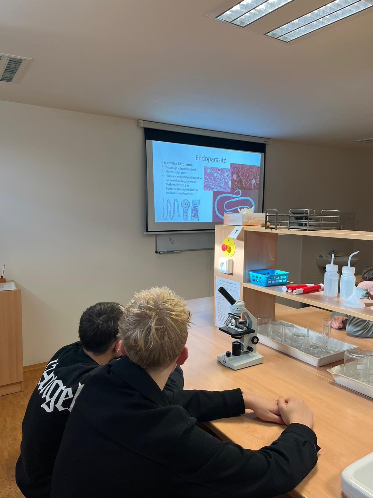 V laboratoři se žáci seznámili s problematikou parazitů, jejich významem a vlivem na lidské zdraví. Společně jsme si ukázali, jak různé parazitické organismy vypadají, a pomocí mikroskopu je mohli žáci pozorovat na vlastní oči. Následně si ověřili své znalosti v interaktivním Kahoot kvízu, který přinesl nejen zábavu, ale i možnost si vše zopakovat.