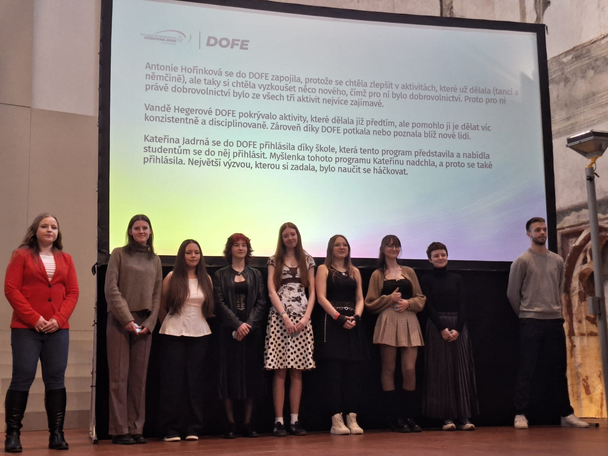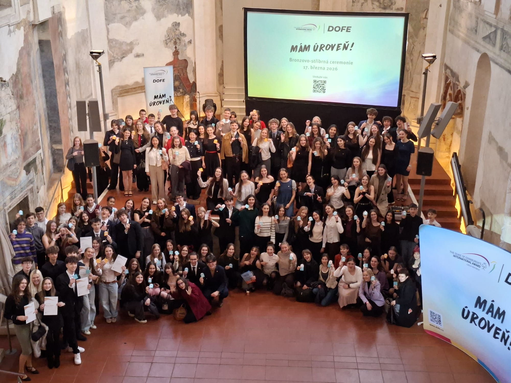 V úterý 17. 3. 2026 vyvrcholilo celoroční úsilí našich žákyň, které v rámci mezinárodního programu DOFE slavnostně převzaly bronzové ocenění z rukou ředitelky české kanceláře Mezinárodní ceny vévody z Edinburghu paní Gabriely Drastichové. Předávání odznaků a certifikátů se zúčastnila i radní pro školství a sport Libereckého kraje paní Jitka Skalická. Toto prestižní ocenění za splnění programu, který v roce 1956 založil princ Phillip, vévoda z Edinburghu, jako podporu rozvoje chlapců a dívek bez ohledu na jejich zázemí, fyzické schopnosti nebo dovednosti převzalo v multifunkčním centru Pražská křižovatka devět našich žákyň. Absolventky programu na ceremonii doprovodily jejich vedoucí paní učitelky Alena Novotná, Svetlana Havlíčková a Kamila Panušková.